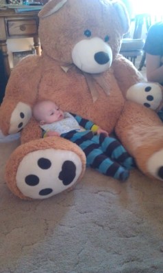 I just love this little man and I am going to be completely honest. I am not 100% percent comfortable around little babies because I am not used to it. I’ve never babysat in my life. Well, I take that back I have but there were old enough to go to the bathroom on their own and knew how to eat. This little guy is a whole new experience for me. He hardly ever screams or anything its nice. Yes what you are seeing in the picture to the right is a giant bear. I got that from one of my friends at school. She couldn’t take it home (her mother told her not to) so she asked me if I knew of anyone who could put it to use and I thought of my little cousin Dex! (Thanks Jobeth!)