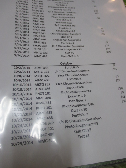 I am finally getting organized my fourth year of college. I was organized in the past, but not this organized. I am hoping that this will help me stay caught up with all the assignments that are due in all of my classes.