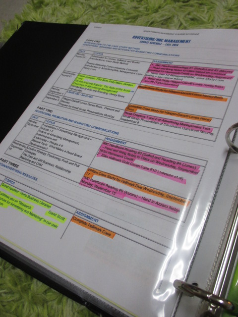 Behind the name of the class I have the assignment list for just that class. I have highlighted the different assignments. For this class readings are in pink, cases are in orange and guest speakers are in yellow.